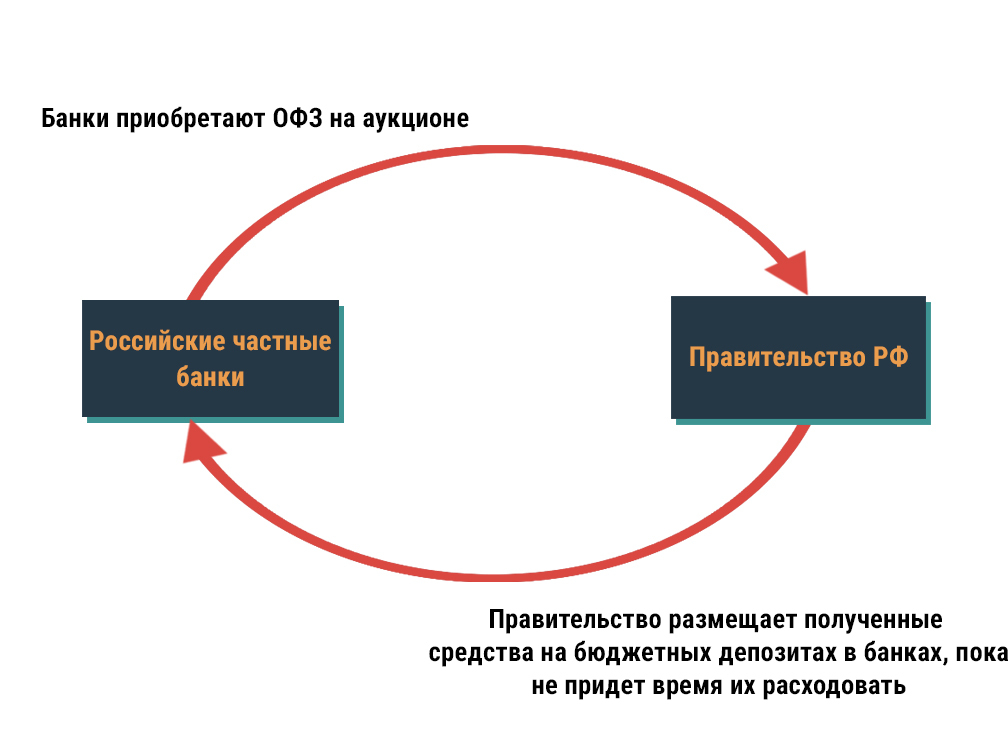 Следовательно, в короткие сроки полученные Минфином 823 млрд рублей вновь окажутся на счетах российских банков и будут использованы, в том числе, для выплат по займам РЕПО. Изобразим это небольшой схемой.