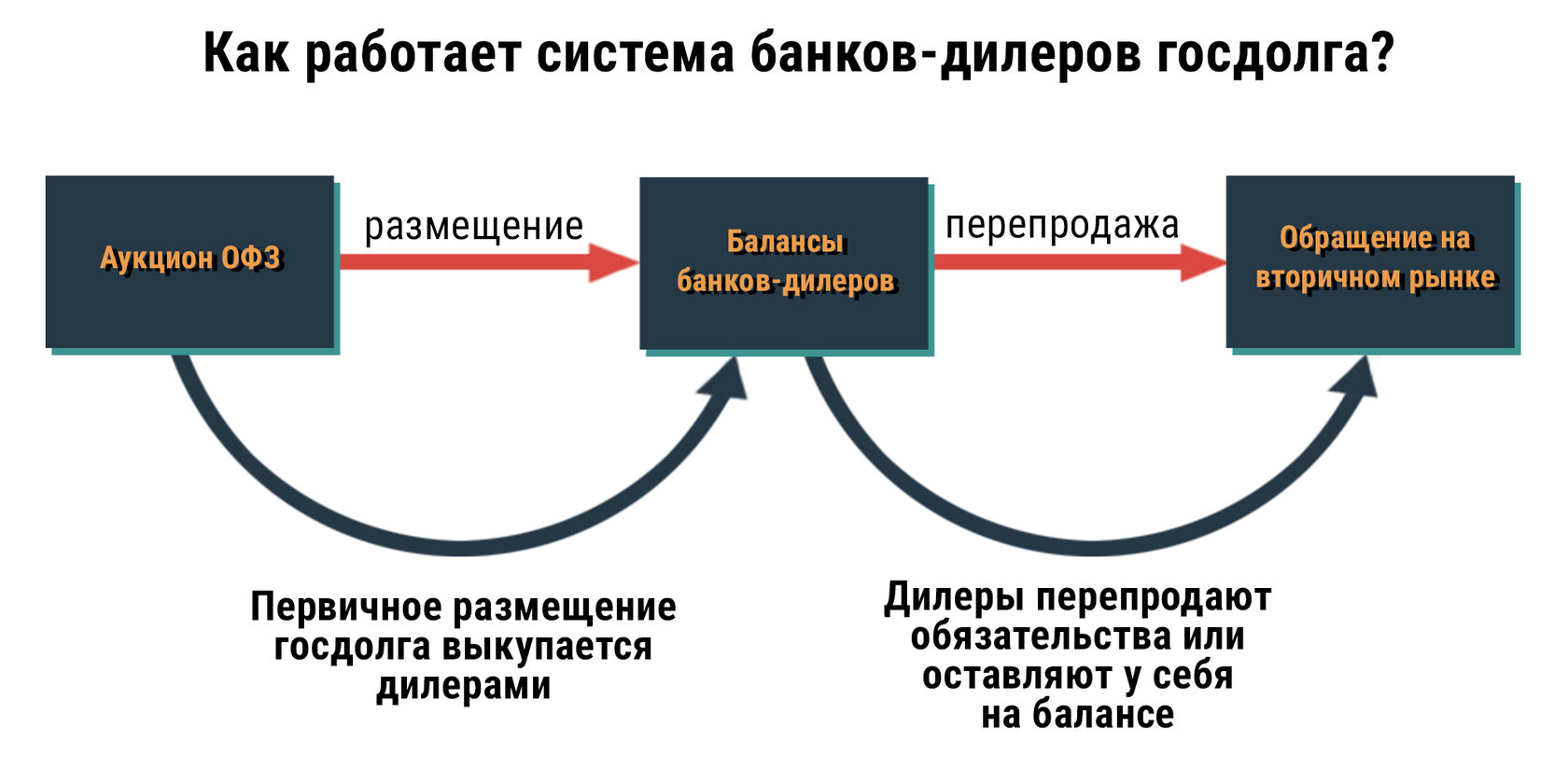 Можно отметить схожесть данной схемы с практикой работы так называемых банков-дилеров, характерной для многих развитых стран. Придерживаясь схожих параметров размещения (и при желании меняя длительность ОФЗ на среднесрочную), Правительство может де-факто финансировать любой дефицит бюджета за счёт размещений на внутреннем рынке.