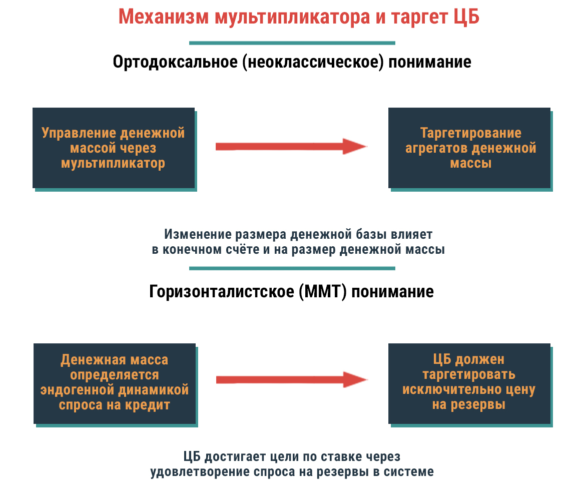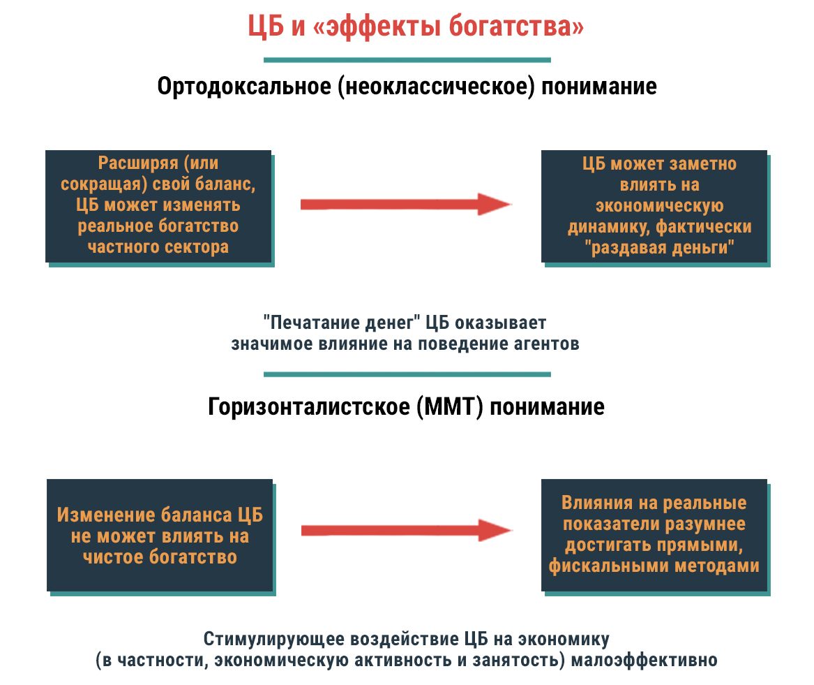 В соответствии с текущими операционными механизмами, баланс Центрального банка эндогенно расширяется и сокращается, эти изменения не создают и не уничтожают чистые финансовые активы частного сектора.Центральным пунктом монетаристского взгляда является предположение, что «деньги не прожигают дыры в карманах» (Егер 1968); таким образом, даже если в реальном мире центральные банки не «сбрасывают деньги с вертолетов» буквально, предполагается, что раз Центральный банк обладает операционной возможностью генерировать избыточную ликвидность (в форме резервов и/или денежной базы) и создавать «