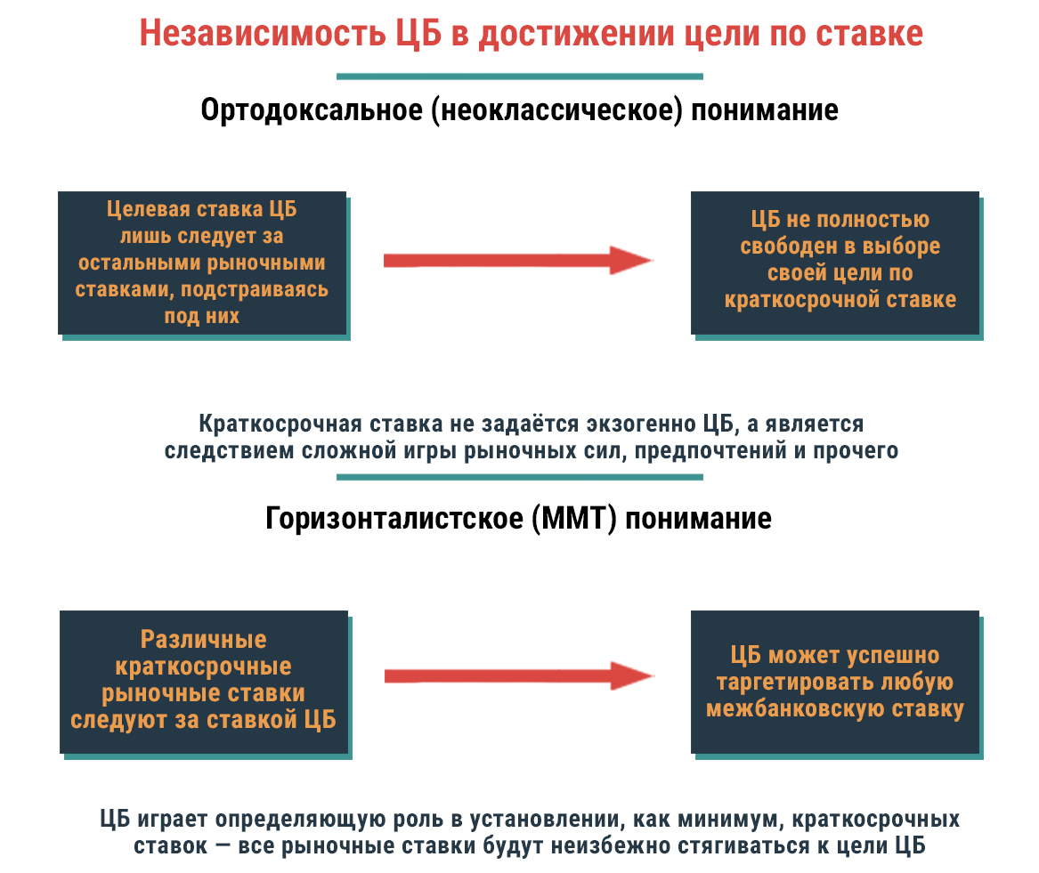 Поскольку это широко распространенная практика, понятно почему в литературе об эндогенных деньгах и дискуссиях о принципах центробанковского дела в целом до текущего момента предоставление резервов ЦБ обязательно рассматривалось как «защитная» и эндогенно обусловленная операция, движимая потребностями совокупного банковского сектора в проведении расчётов и удовлетворении резервных требований. Однако целевая ставка, установленная равной ставке, которая выплачивается по резервам на балансе, как предлагается в Принципе 6, на самом деле позволила бы установить